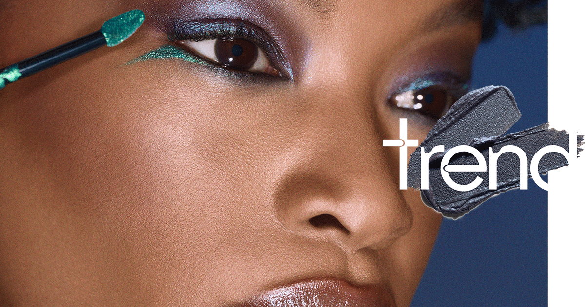 Een blauwgroene chromen blik en glanzende spiegellippen geven deze Y3K-look een back-to-the-future energie.