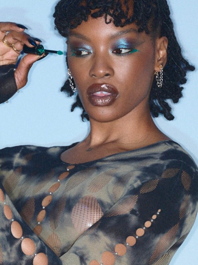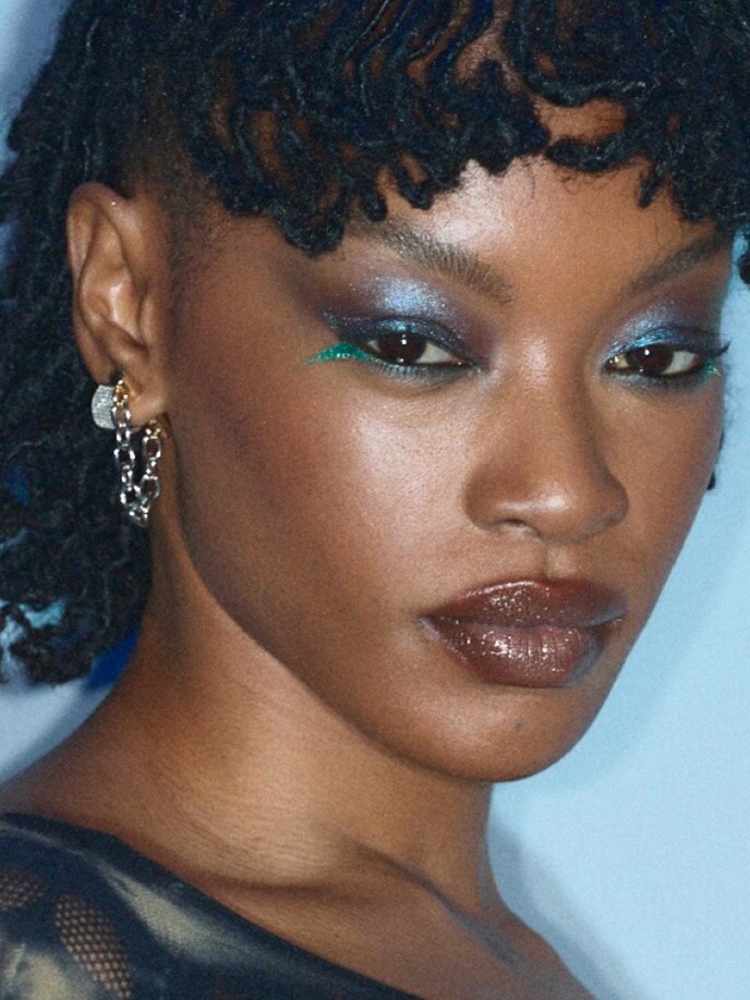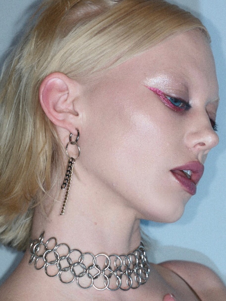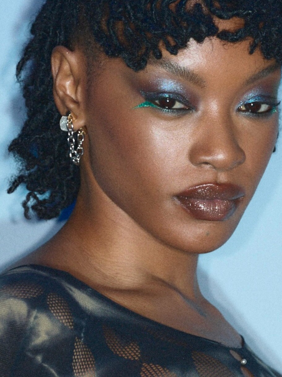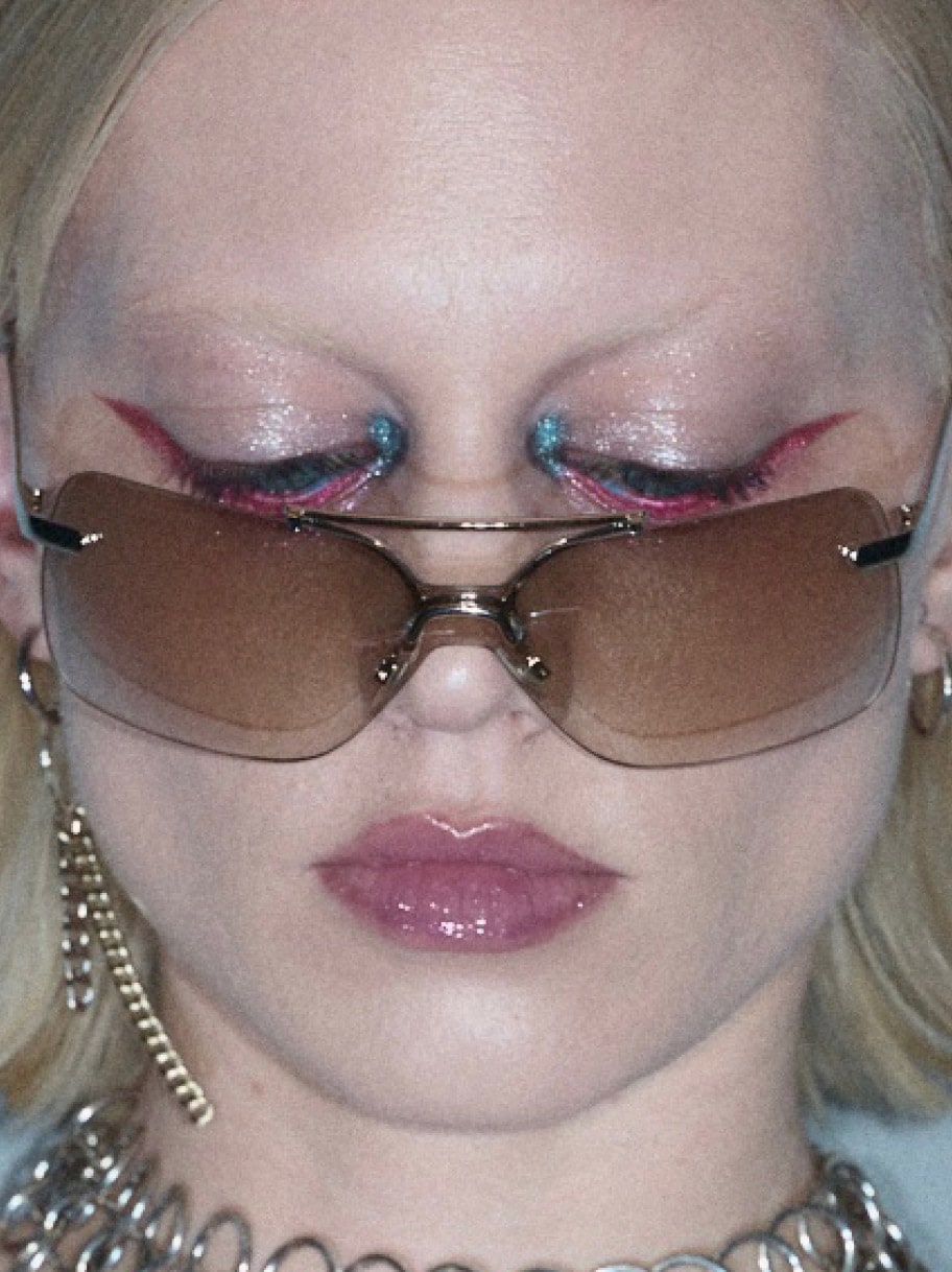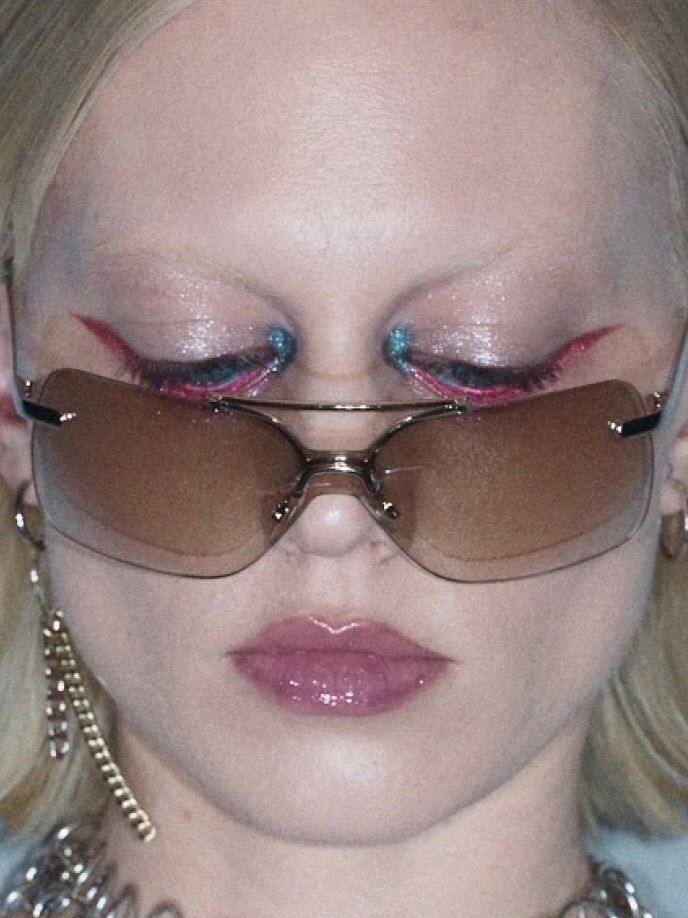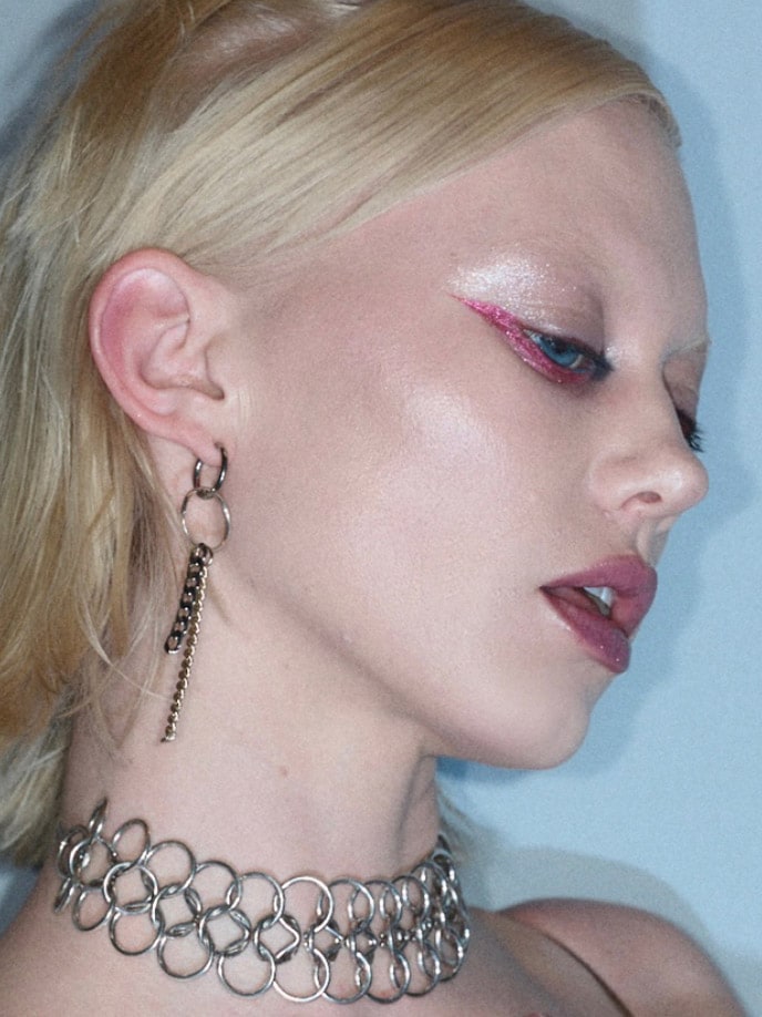 Enter Shadeshift Chrome Eye Shadow and Dazzleshadow Liquid,strategically used on the bottom lash line. “Het was een twist van traditionele eyeliner. In plaats van omhoog, gaan we naar beneden, echt futuristisch, echt gedurfd.” De combinatie van deze stralende, bijna reflecterende metallics is echter de belichaming van de Y3K-esthetiek.